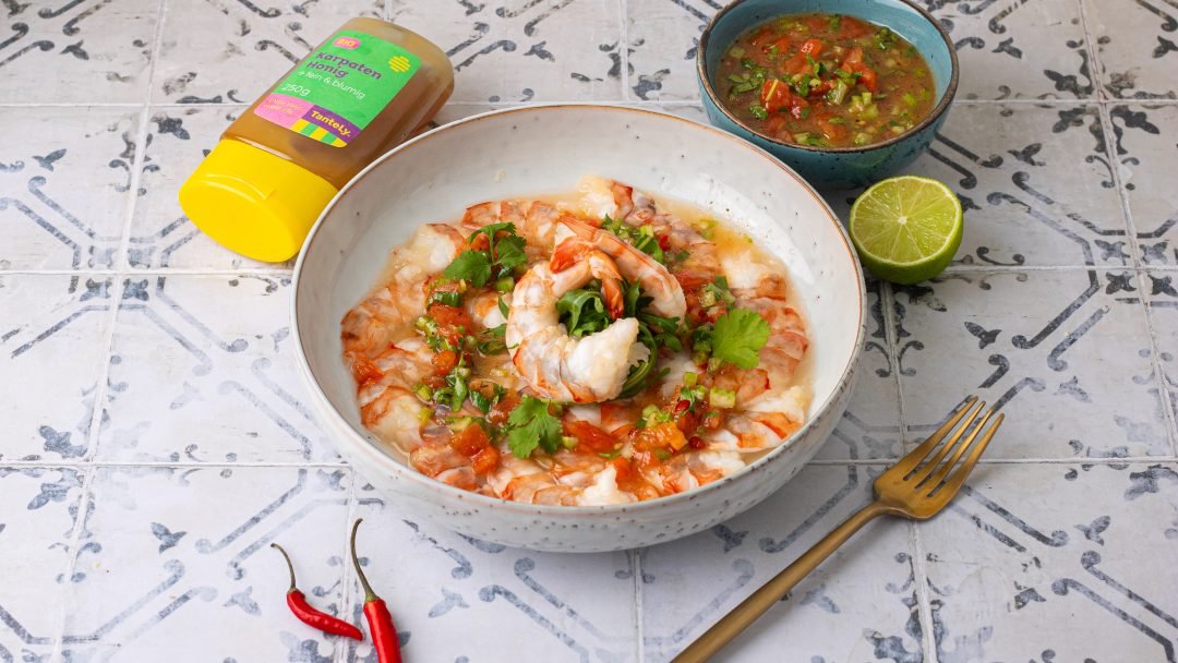 4. Die fertigen Garnelen aus dem Limettensaft nehmen, gefächert auf einen Teller legen und mit der Marinade übergießen. Mit Korianderblättern garnieren.