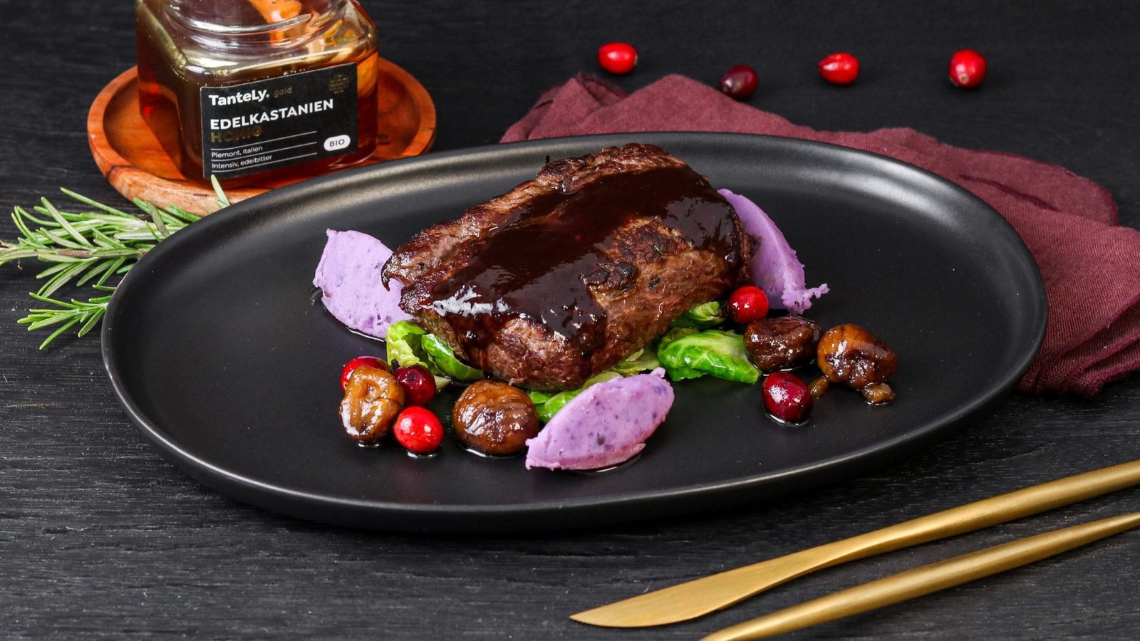 - Das Kartoffelpüree zusammen mit dem angemachten Rosenkohl und den Maronen auf einem Teller verteilen. Dann das Stück Hirschrücken dazugeben und mit der Bratensauce toppen.